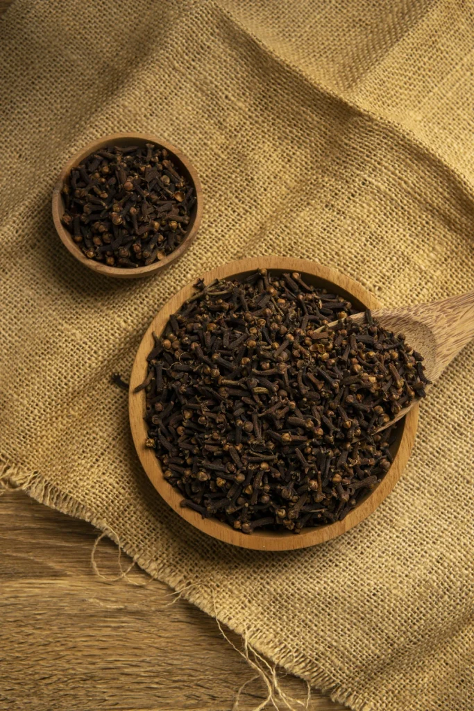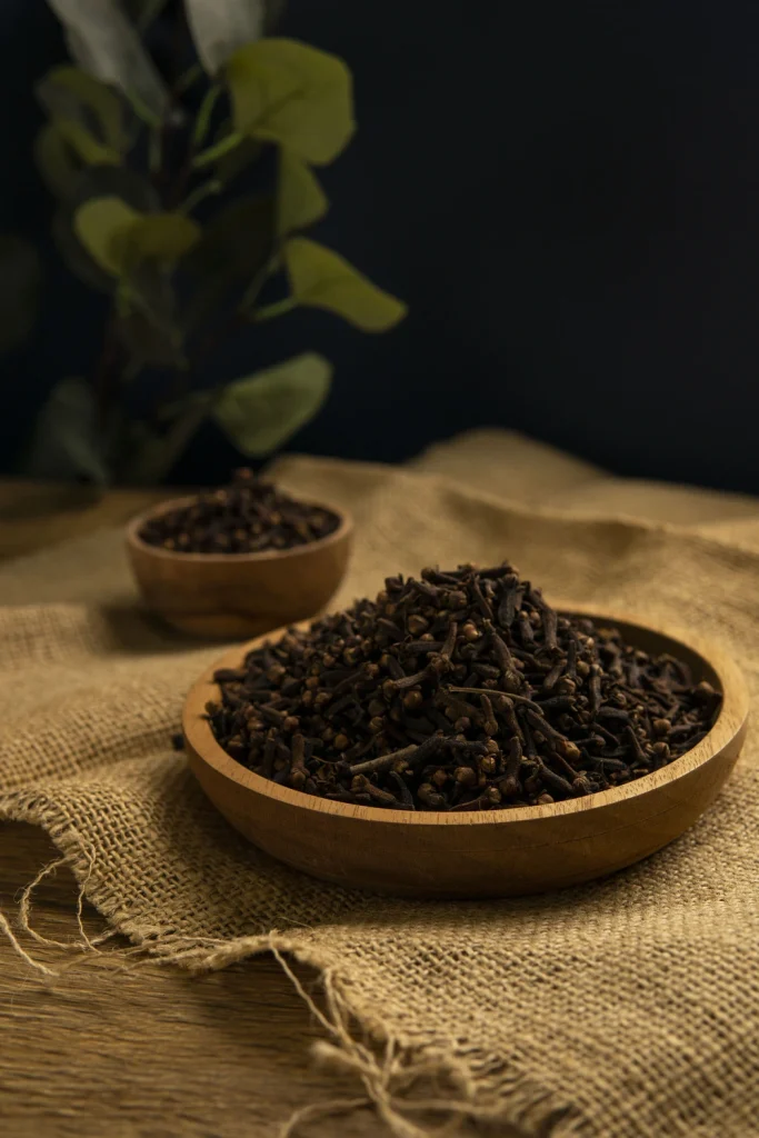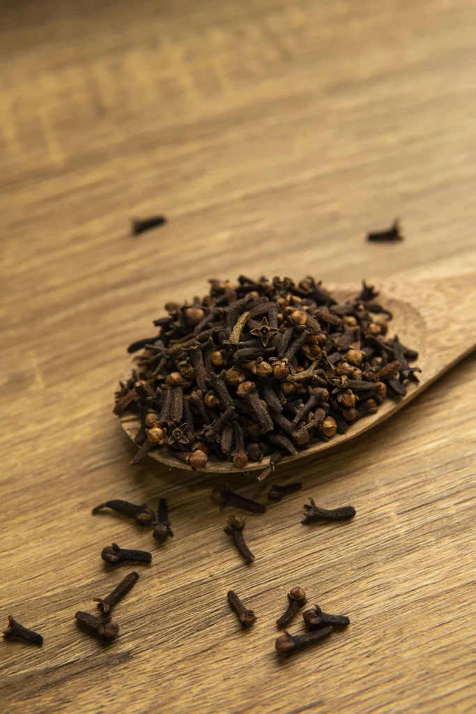 Cloves are aromatic flower buds from the clove tree, native to the Maluku Islands in Indonesia. They are typically harvested when they are pink and dried until they turn brown. Cloves have a strong, pungent flavor with sweet undertones and are commonly used as a spice in cooking, especially in baking and savory dishes. They are also used in traditional medicine and for their essential oil, which has antiseptic properties. Cloves are known for their distinct shape, resembling small nails, which contributes to their name in Latin, “clavus,” meaning nail.